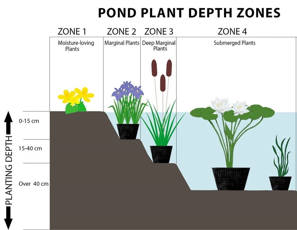 A good all round depth of about 300-400mm (12-16 inches) will accommodate most Submerged plants, including Hardy water lilies.